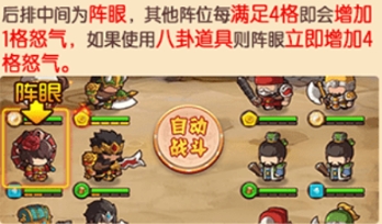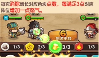 消除色块提升对应的站位武将的怒气,每次消除增长对应色块点数,每满足3点对应位置增加一点怒气,后排中间为阵眼,其他阵位每满足4格会增加1格怒气,如果使用八卦道具则阵眼立即增加4格怒气。战斗中怒气值满将会释放技能,每4格怒气释放1次技能,最多可以连续释放3次。