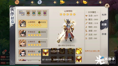 推荐度:★★★★★推荐理由:作为一直被玩家们诟病的后土门派导师,山神帝昀在伙伴之中的排位却是最高的,原因就是他的高星级被动技能“山岳之体”的特殊效果,“山岳之体”可以让山神帝昀在进入战斗后立刻进入地魂之心状态,即能够在第一回合就释放出强力的破山连打,造成在伙伴之中出现的最高群体物理伤害。“岩石震击”也为山神帝昀提供了一定程度上的反击手段,以此度过在破山连打释放后进入的休息期。山神帝昀属于加强完全版的后土,是一个如同坚固的岩壁一般值得依赖的伙伴。情牵一世,三生同袍。以上就是猎心师手游中小编推荐大家培养的部分伙伴了,相信猎心师手游伙伴之中谁最可靠,每一位玩家的心里都有自己的看法,赶快前往猎心师手游,挖取宝图,打开宝箱,召唤出你所喜爱的,最可靠的伙伴吧!