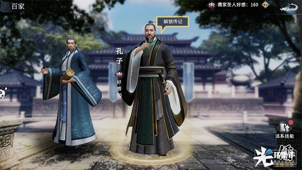在儒家学派中,主公可解锁两位儒家代表人物分别是:孔子与孟子。圣人的传记解锁可通过钻研学说进行,每位圣人的技能各有不同。