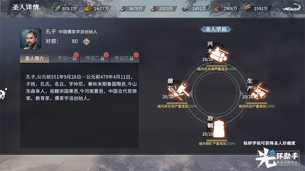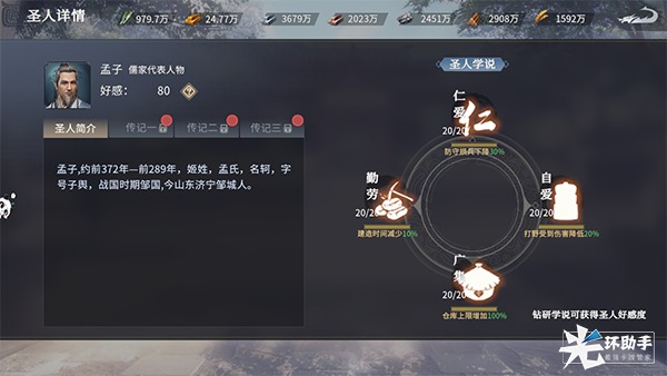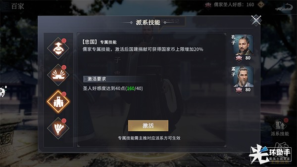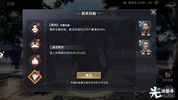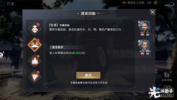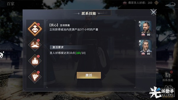 提高圣人好感度,不仅能解锁圣人传记,还能激活各派系的独家技能。儒家派系的专属技能分别是:民心、生息、忠国、调剂。