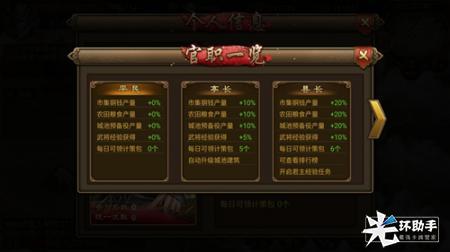 在《朕的江山》游戏提升官职可以得到很多收益,便于达成游戏胜利目标。其收益包括:市集铜币产量加成,农田粮食产量加成,城池预备役产量加成,每日可领取计策礼包。