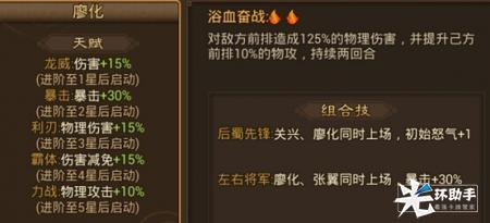黄忠:橙将二星增加45%暴击,黄忠是一个后排输出武将使用暴击和强大的物理伤害进行攻击不得不提就是黄忠的天赋都是为了输出产生的一个强力武将推荐使用:五星