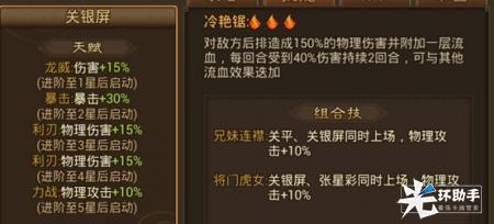 关银屏:紫将二星增加30%的暴击,关银屏是一个强力后排武将天赋五星都是增加输出的存在,组合技配合关平和张星彩还能增加20%的物理伤害,是一个强力后排首选。