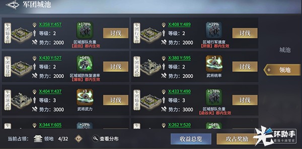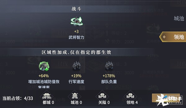 区域性加成,此种类型的军团城池在对应的郡内,玩家城池或行军部队可以获得属性效果