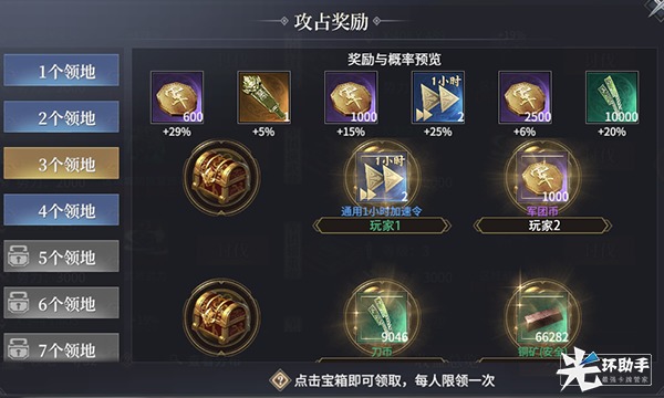攻占达到一定数量后,军团内的所有成员还可以领取一次宝箱奖励