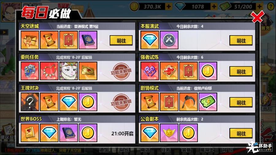 如果玩家们实在不知道该如何进行金币的获取,那么直接可以在主城页面当中找到每日必做的任务。进入到该页面当中,玩家们可以直接看到天空谜城、本服演武、强者试炼、剧情模式、工会副本、世界BOSS。