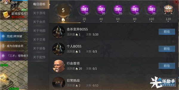 之后大家就可以根据游戏左侧的任务栏及游戏右上角的打金指南-每日目标进行任务啦!