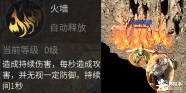 火墙:法师另一个招牌技能,释放火焰元素,点燃目标附近的地面,对这片区域的敌人造成持续性的伤害。虽然看上去不怎么显眼,也没有高额的伤害,但正所谓温水煮青蛙。长时间的持续灼烧累积起来就能产生十分可观的效果,同时也能对大范围内的敌人进行输出而不影响自己对主要目标使用其他技能。