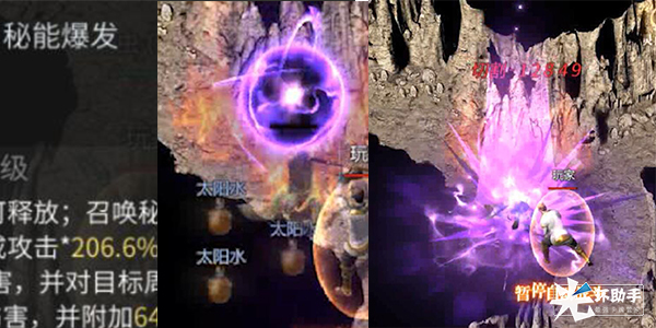 秘能爆发:法师的蓄能技能之一,,需要等待能量缓慢积蓄完成后才能使用。消耗所有能量,飞身跃向空中,召唤秘术能量球猛击地面。对主要目标造成极高的爆发伤害,同时也能对周围敌人产生大量伤害。这是法师的终极爆发技能,令对手在强大的古代秘术中泯灭。