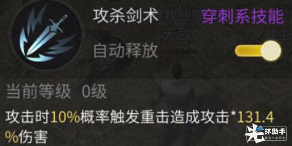 刺杀剑术:迅猛的下劈攻击,剑气覆盖前方两格的区域,对敌人造成伤害,对距离远的那一格伤害更高且无视法师职业的魔法护盾。如果能够灵活运用这一特点,就能对法师造成极大的威胁。