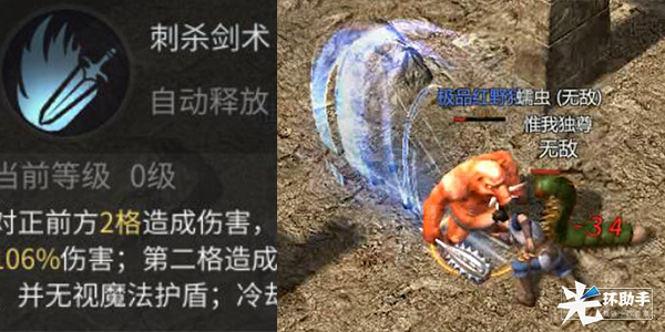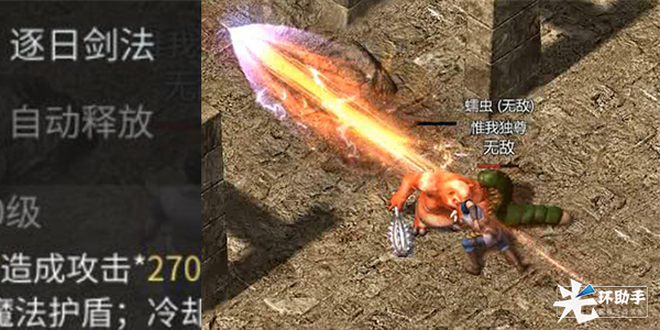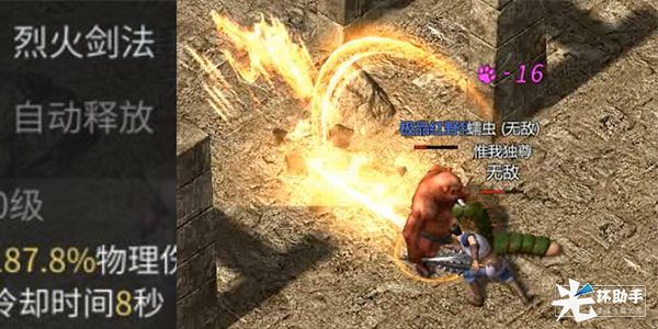 烈火剑法:战士的高级技能,将焚尽一切的烈焰附着于刀锋之上,造成大量伤害的同时有几率无视魔法护盾。