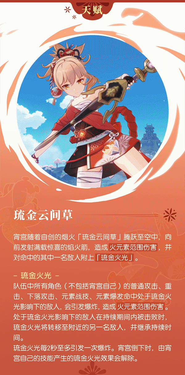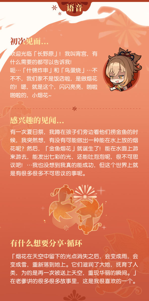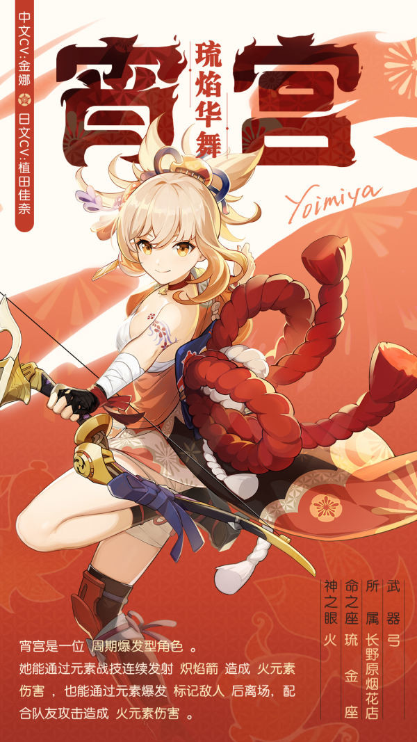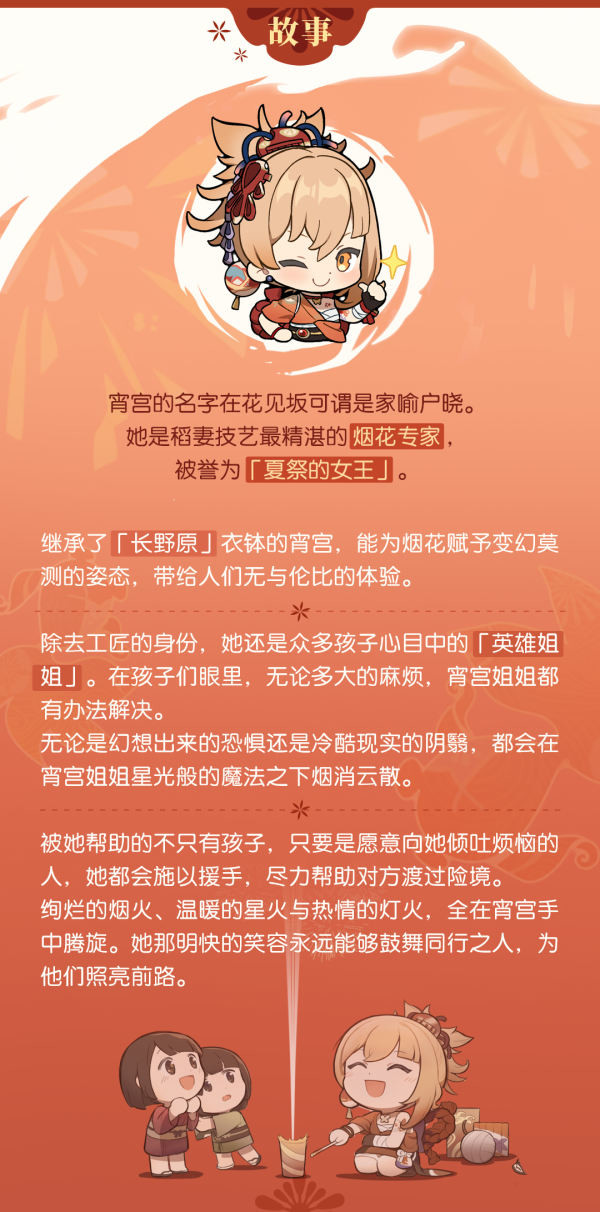 「想看烟花吗?」——「琉焰华舞」·宵宫!!飞翔的丘丘人发布于 2021-08-05 旅行者们好呀~ 今天要介绍的主角,在稻妻的花见坂可谓是家喻户晓。她是稻妻技艺最精湛的烟花专家,被誉为「夏祭的女王」。 旅行者们是不是已经猜到她是谁了?没错,她就是「长野原烟花店」的店长——宵宫。一起来了解下她吧~