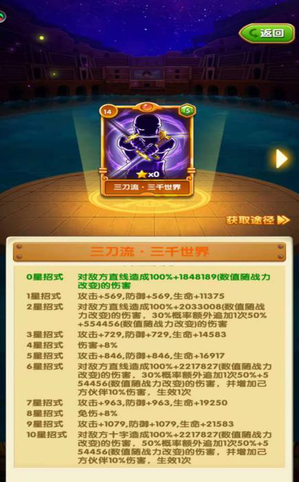 当玩家达到91级的时候会开放新玩法招式,最新出的橙色招式卡三刀流三千世界目前获取的途径为328自选宝箱,属于氪金卡。