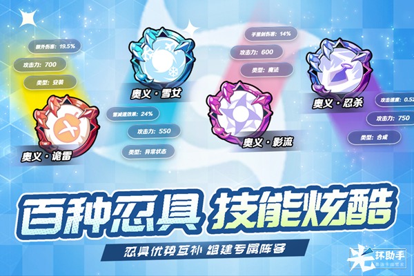 忍术的种类多种多样,24种拥有强大攻击能力的忍具,11种各具特色的强力辅助,10种神秘莫测的召唤忍具以及3种拥有华丽控制手段的控制忍具。仔细研究忍具的特性,灵活搭配编队方能更为轻松的战胜对手。