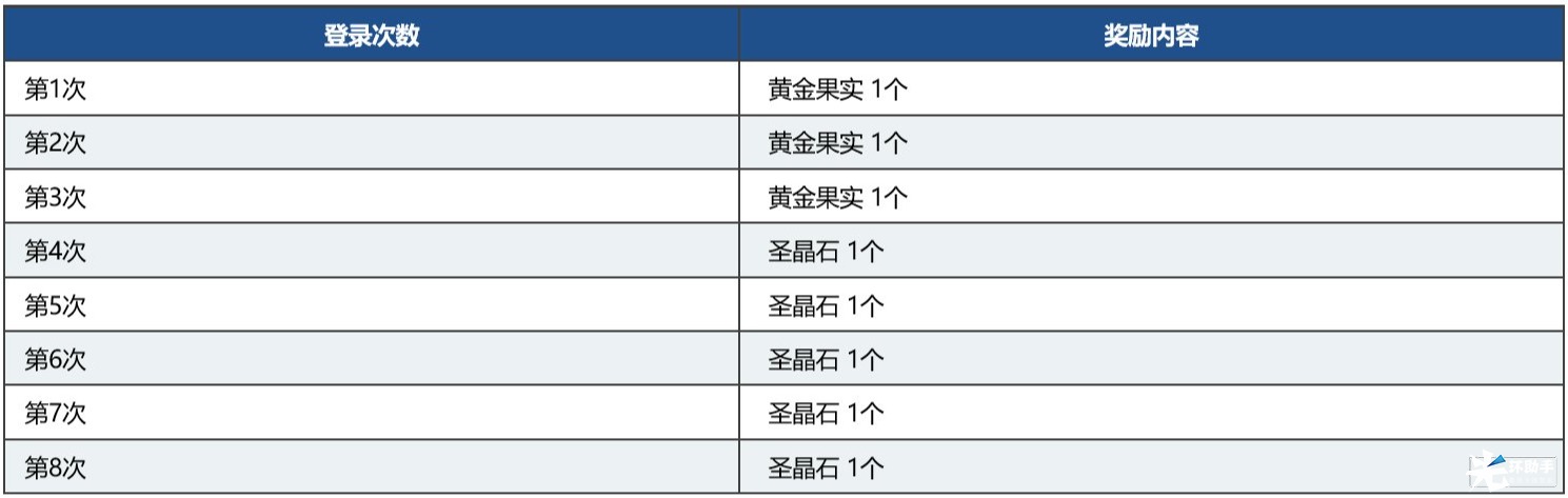 在以下时间段内,累计登录8次(1天内多次登录仅会计为1次),即可获得最多3个黄金果实和5个圣晶石的奖励!