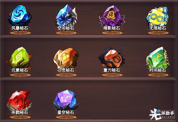秘石一共分为10种,分别为:风暴秘石、空间秘石、暗影秘石、无限秘石、元素秘石、心灵秘石、重力秘石、时间秘石、杀戮秘石和星空秘石。