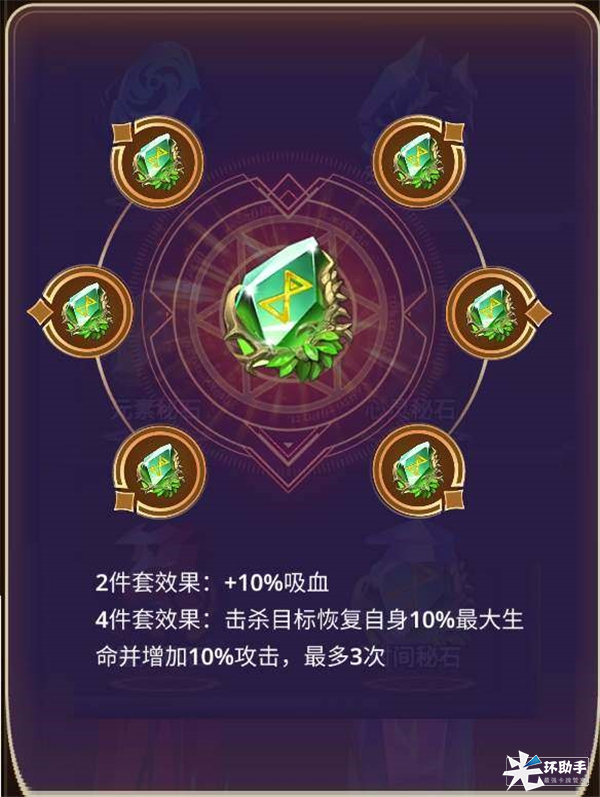 有随机固定主属性的位置:二号位、四号位和六号位可以都要加秘石生命的秘石,这样就能使这个英雄的生命最大化,从而达到技能优势最大化的效果。
