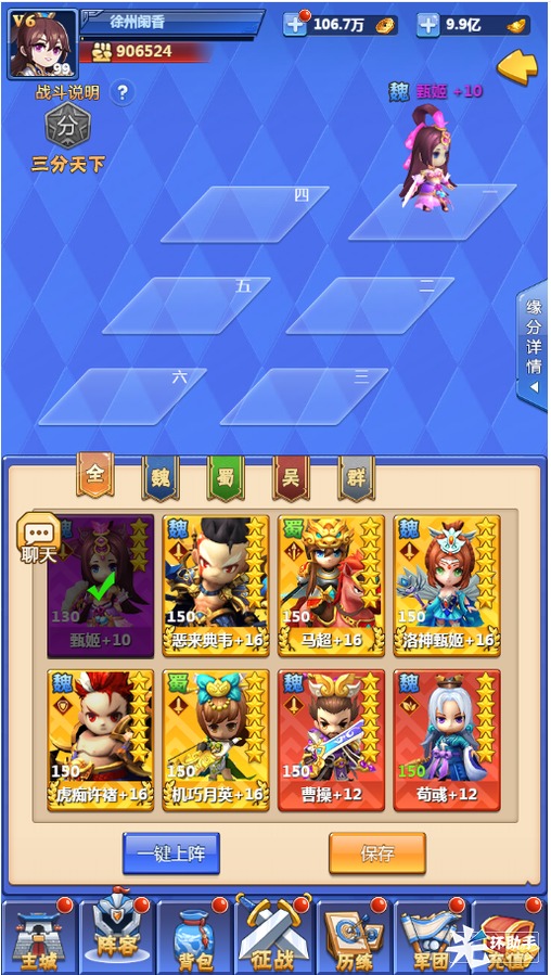 1、玩家可通过布阵,上阵武将参与战斗,最多可上阵6名武将。