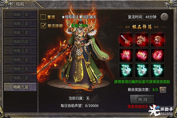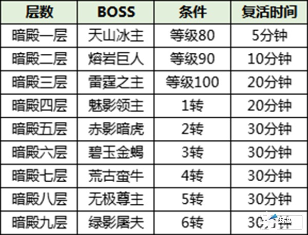 《狂暴传奇》暗殿进入条件讲解士官长发布于 2021-10-05Hello~各位勇士,小编又给各位带来新的攻略啦,这次小编想和大家聊聊暗殿~众所周知暗殿有很多层,里面有很多boss,击杀它们可以获得不同的奖励,那么想要进入暗殿需要什么条件呢,就让小编一一说明吧!首领挑战-暗殿符合要求就能进入相应层数,暗殿会掉落很多稀有道具归属玩家击杀怪物后可获得双倍奖励,每日三次非归属玩家击杀怪物也能获得一份奖励,协助本行会其他玩家还能获得声望协助本行会玩家可以获得声望但是不能获得击杀奖励