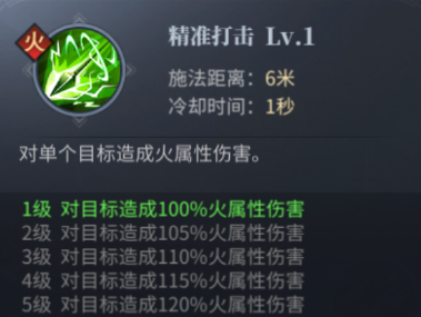 精准打击:对单个目标造成火属性伤害。进阶技能可以提升精准打击技能威力,并忽视目标部分火属性抵抗。