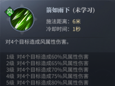 箭如雨下:对4个目标造成风属性伤害。进阶技能可以忽视目标部分风属性抵抗并造成“侵蚀”效果,10秒内使目标持续受到伤害。