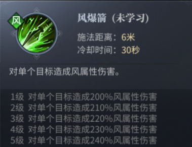 风爆箭:对单个目标造成风属性伤害。进阶技能可以提升风爆箭技能威力,使目标禁锢并降低技能15秒的冷却时间。