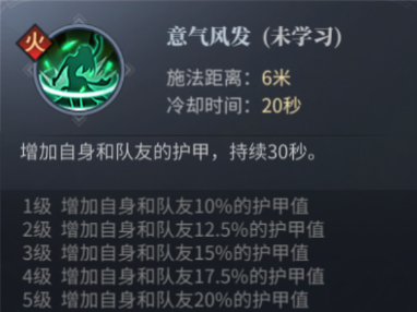 意气风发:增加自身和队友的护甲,持续30秒。进阶技能可以提升自身伤害、属性抵抗并增加火、风属性的穿透。