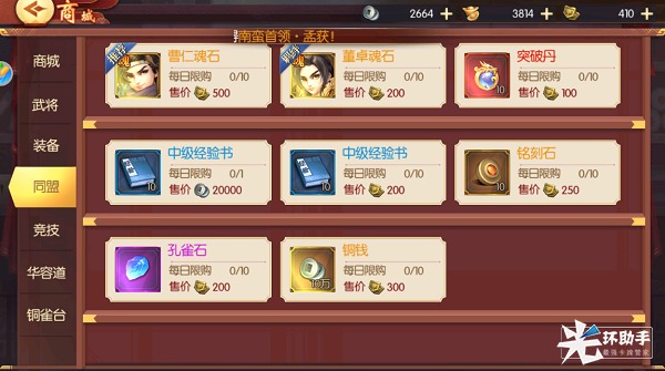 同盟商城的物品是固定的,使用同盟贡献进行兑换,有武将碎片突破丹、经验书、铭刻石、孔雀石、铜钱,前期缺钱,缺经验书,可以重点兑铜钱、经验书,后期装备铭刻可以兑换铭刻石。