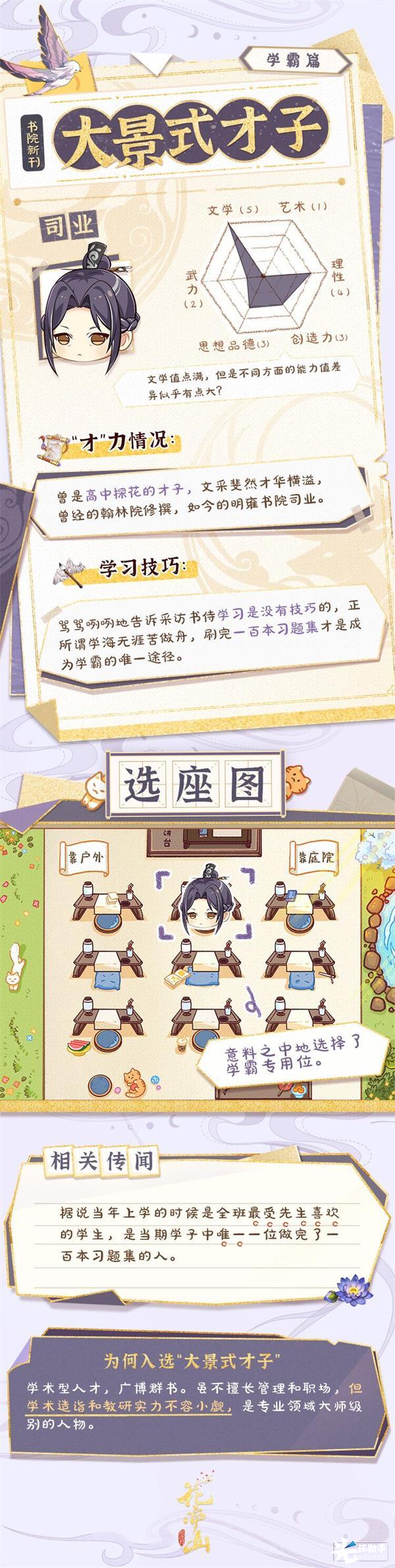 《花亦山心之月》大景式才子(学霸篇)——司业伊辛贝露发布于 2021-10-29能称之为“才子”之人往往拥有过人的学识,我们的司业大人便是如此。其曾是高中探花的才子,文采斐然才华横溢。如今献身于教育事业,常常严厉督促学子们完成学业。据说当年上学的时候是全班最受先生喜欢的学生,学习建议是学海无涯苦作舟,埋头习题册为王道(手动狗头.jpg)。