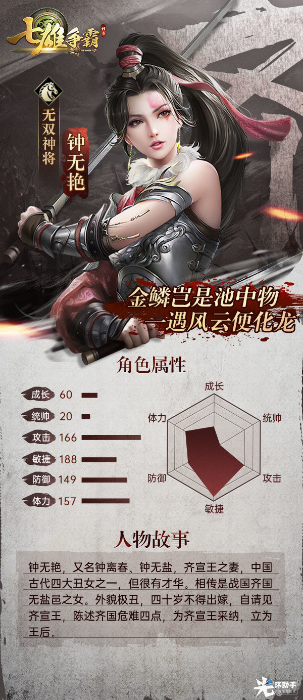 《七雄争霸H5》武将介绍——钟无艳白纸扇发布于 2021-12-02“钟离春”为中国古代四大丑女之一,但很有才华。相传是战国齐国无盐邑之女,外貌极丑,四十岁不得出嫁。为拯救国家,钟无艳冒死相劝齐宣王,向其陈述齐国危难四点,终为齐宣王所采纳,并立为王后。于是拆渐台、罢女乐、退谄谀,进直言,选兵马,实府库,齐国大安。