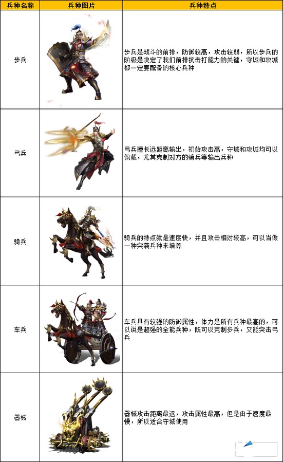 《七雄争霸H5》兵种介绍白纸扇发布于 2021-10-12《七雄争霸》中兵种分为5种,分别为步兵、弓兵、骑兵、车兵、器械,不同兵种有不同的特点和相克属性。而战场上,君主们作为统帅往往必须对各种兵种了若指掌,这样才能在安排阵型和确定各种战术时,充分发挥其特性。以下便是游戏内各种兵种的介绍,一起看看: