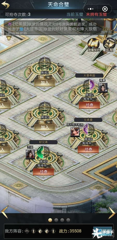 当君主在游戏中加入联盟后,就可以在日常任务-合璧台中,接取每日的合璧任务。当同一联盟的玩家拥有两块相同品质、不同位置的玉璧时,可以进入相应房间进行合并。在等待合璧的过程中,还可以对非盟友玩家进行房间抢夺,一次性击败两个对手,就可以抢夺对方的玉璧奖励啦。