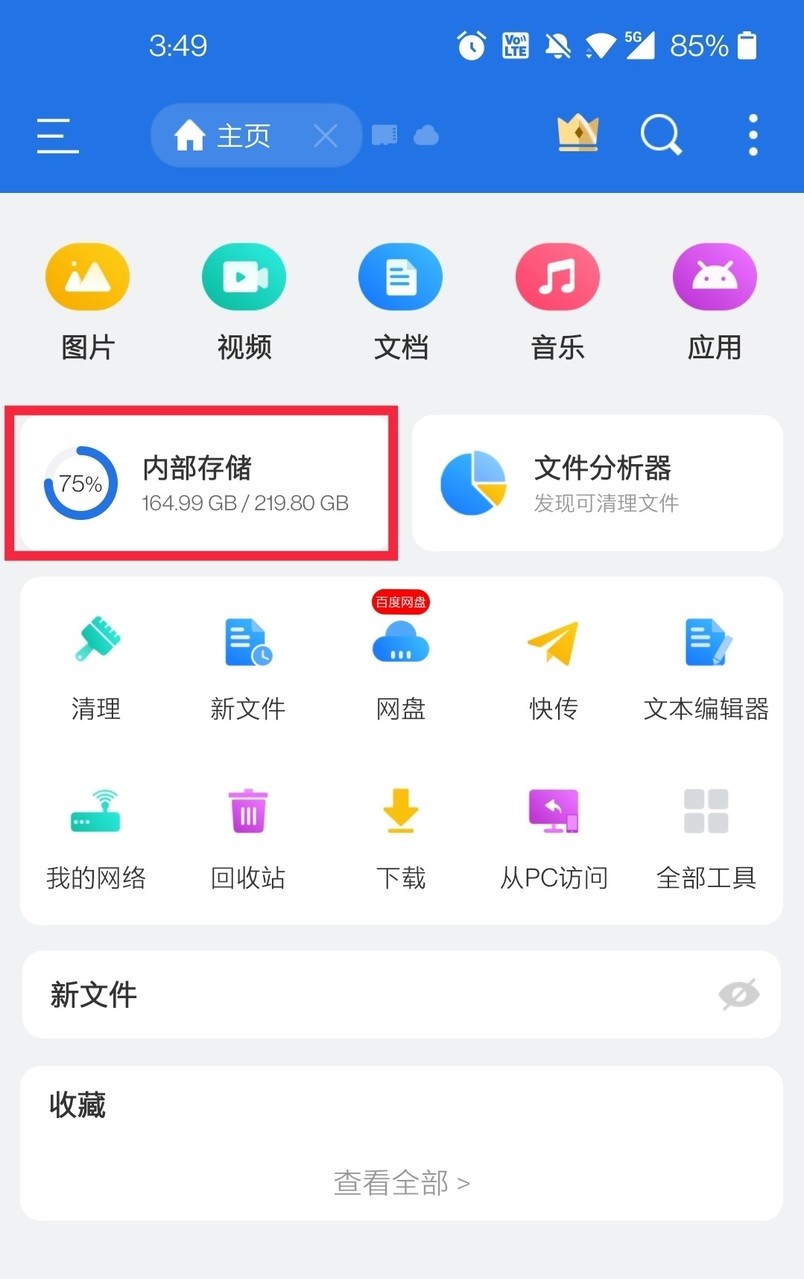 第二步: 打开ES文件浏览器,点击内部存储