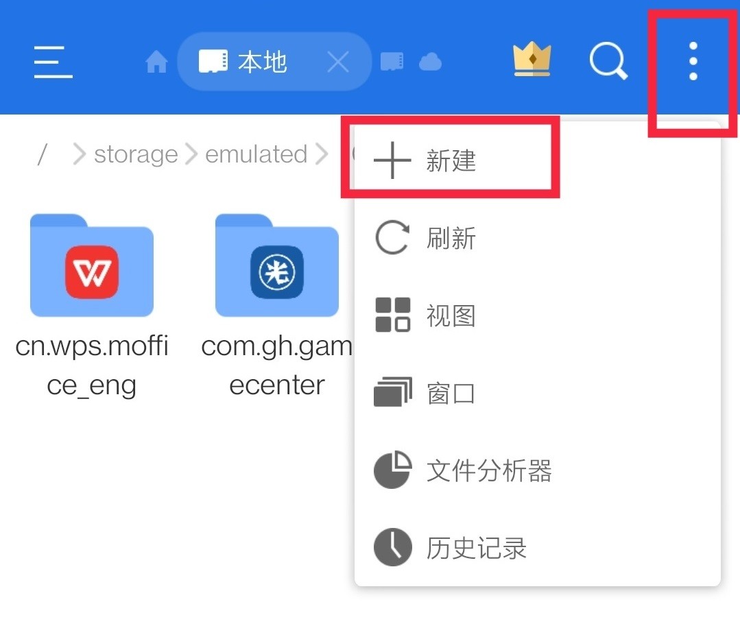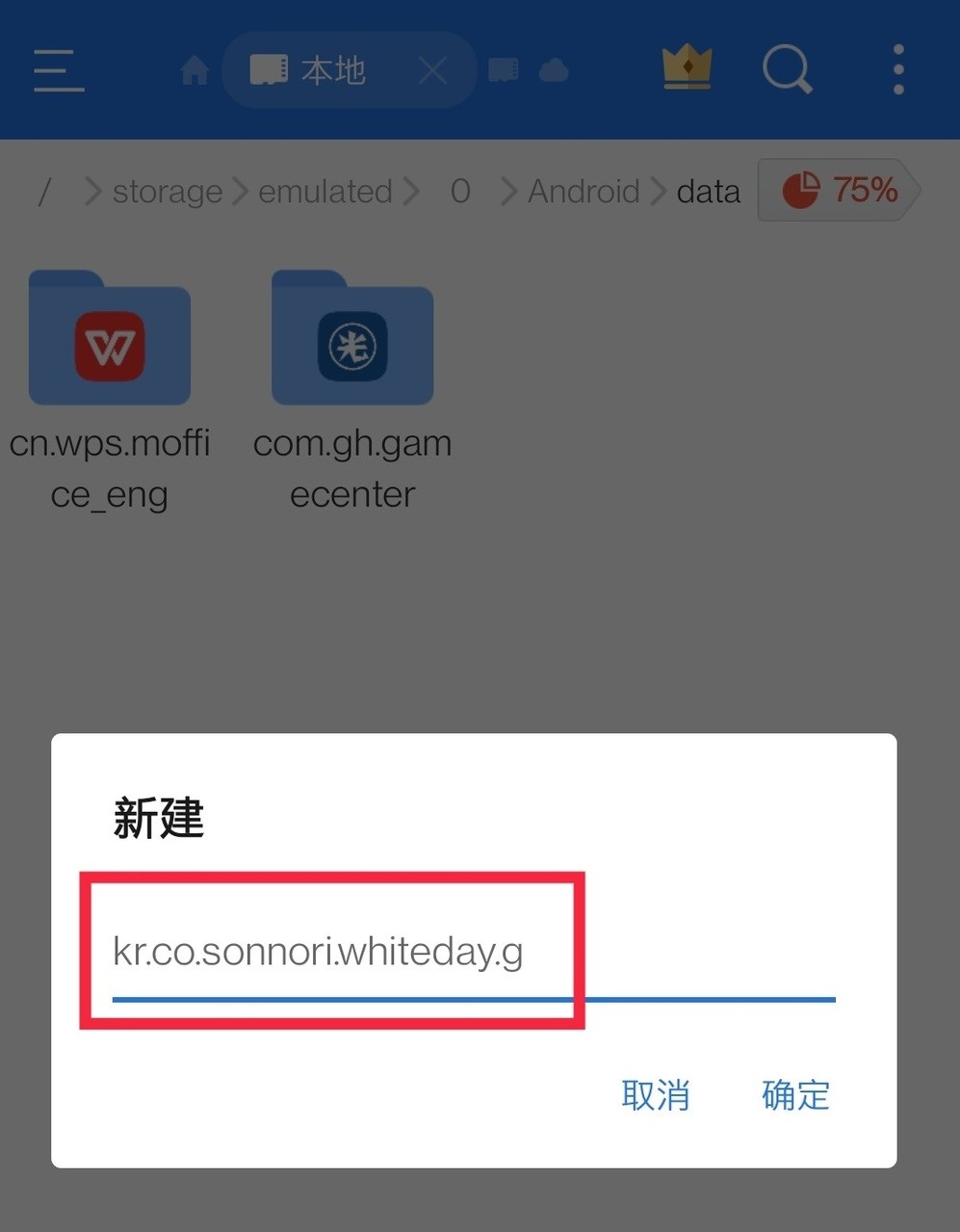 第五步:点击右上角,新建文件夹,文件夹名字改为“kr.co.sonnori.whiteday.g ”