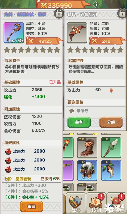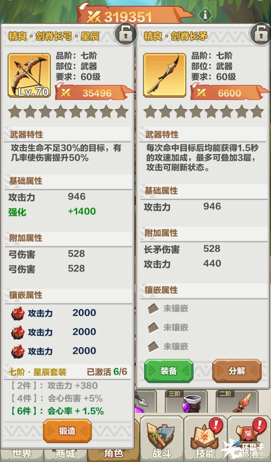 《勇者养成记》装备系统白纸扇发布于 2021-12-16在游戏中,角色装备有武器、上衣、护腕、鞋子、戒指、挂坠等六种。武器分为长矛、法杖、弓箭、骨镖这四类;长矛-均衡型武器,中等伤害,中等攻速;法杖-重型武器,攻击力极高,攻速较慢;弓箭-轻型武器,攻击力较低,攻速较快;骨镖-回旋型武器,回旋伤害较低;除此外,装备还有套装效果,集齐2、4、6件同套装时,还会有不一样的加成效果。