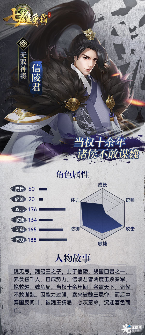 《七雄争霸H5》武将介绍——信陵君白纸扇发布于 2022-01-02信陵君“魏无忌”,是战国中后期魏昭王的儿子,魏安釐(僖)王的异母弟弟,从血缘关系上来说,他是正儿八经的王族公子。信陵君在得到魏王的支持下,充分发挥自身优势,广招门客礼贤下士。先后组织起两次规模较大、影响深远的合纵运动,将秦国击败,名扬天下,立下不世之功。