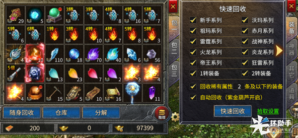 《凤凰传奇》散人福音——装备回收系统bzs发布于 2022-01-25装备回收是《凤凰传奇》中一个非常重要的玩法,不仅可以回收装备,还支持材料回收哦。 回收炉的位置在盟重土城【338:332】 点开回收炉,玩家可以通过勾选背包中的指定装备、神器、材料来进行快速回收。回收后对应物品消失,玩家可获得大量经验值与元宝。如玩家拥有紫金葫芦还可开启“自动回收”功能,则在背包已满的情况下,继续获得道具将会自动回收已勾选的装备、材料,是喜欢挂机打宝的玩家必备哦~