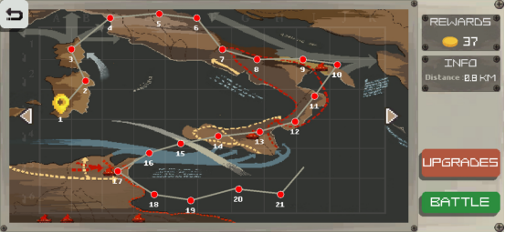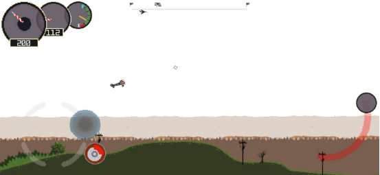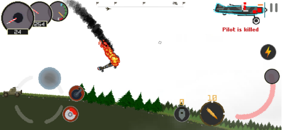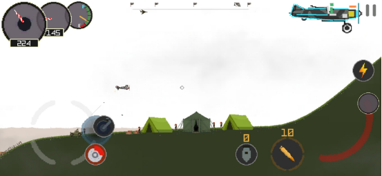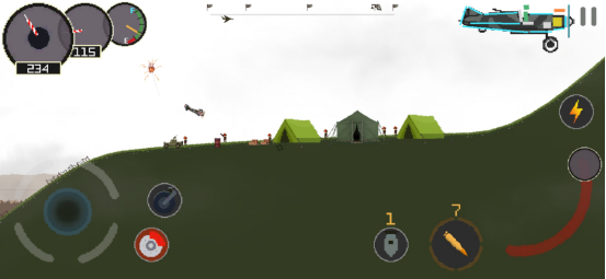 游戏在语言上是英文,在一些引导教程上和背景介绍上还是比较考验玩家语言功底的,所以还是希望有个汉化版的哈,游戏以像素画风为依托,将战争题材的氛围融入其中,将飞机驾驶到天空中进行轰炸,就这一点来说游戏还是很有吸引性的,不过就游戏的整体操作上开始还是有些难度,尽管游戏在引导教程上有引导玩家一步步的去进行游戏前期的探索,但是在具体关卡中的实际操作并不是很友好,如果你是手残党的话,那你大部分的概率一定会是被坠毁。虽然游戏在很大程度上在细节内容上做的很到位,通过金币的方式不断的升级机体的各个零件部位,比如搭载的武器,起飞的机冀及滑轮等等,都有很细节的设计在其中,都是为了能让飞机提高生存能力,而飞机的生存能力很大部分体现在玩家的操作上,玩家从开头的起飞,中间的轰炸敌人到最终的平安降落,如果有一点不小心的偏差方向都有可能机毁人亡,这就比较要求玩家的操作啦。