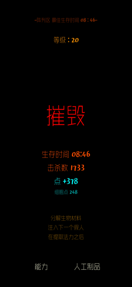游戏的画风设计比较简单,算不上是比较恐怖,但也不是很耐看,而游戏中的角色造型则是以小黑人出现,在游戏场景都渲染下,角色造型还是比较有特色的,但在整体画面还是有些差强人意的,不过也不是很影响游戏的体验,游戏玩法就很简单,开局玩家可以选择五种角色人物进行冒险之旅,每一个角色代表着种族不同,所在闯关中发挥的技能有所不同,而游戏并不是以关卡为形式推进游戏整体,只要角色的血值不掉下去,你就可以一直控制角色生存打怪下去,玩家需要在打怪的过程中,不断的收集一些资源及技能加成,好像最终的目的是为了获得MP值,至于这个MP值是用在干啥的,游戏也没有进行过多而阐述,而在打怪过程中,基本上都是一些黑色团状怪物,后期会出现其他的一些怪物,不过都是以黑色为主色调的,而这样的画风渲染,多少给到玩家一种密集恐惧症的感觉,而在生命值消耗殆尽时最后总结,也是有玩家生存的时间及击杀怪物数量和细胞点等等,虽然不知道有具体有啥用处,但能肯定的是剧情中的一部分。