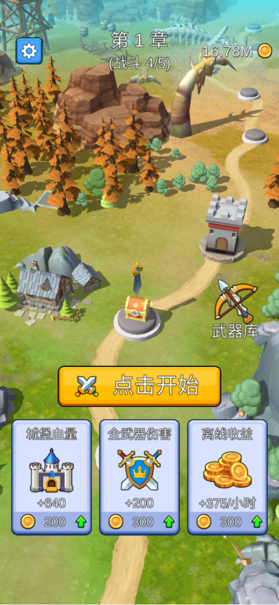 游戏中以章节式的闯关机制推进整体发展,而在这个过程中,每一章节中都是分为几个小关卡,玩家在闯关的时候,能感受到不同场景下,各种武器到来的短暂新鲜感及一定的可玩性,能很好的吸引玩家为之驻足游玩,而游戏中也是在主界面中设计了城堡血量及全武器伤害等,如果伤害不够的话,玩家可以通过金币不断的提升城堡血量及射击武器的伤害,而在这个基本的设定下,敌方士兵要靠近城堡就完全不可能的,当然这也难免在后期体验中会有些许的乏味枯燥,但这并不影响游戏本事在前期的探索趣味性。