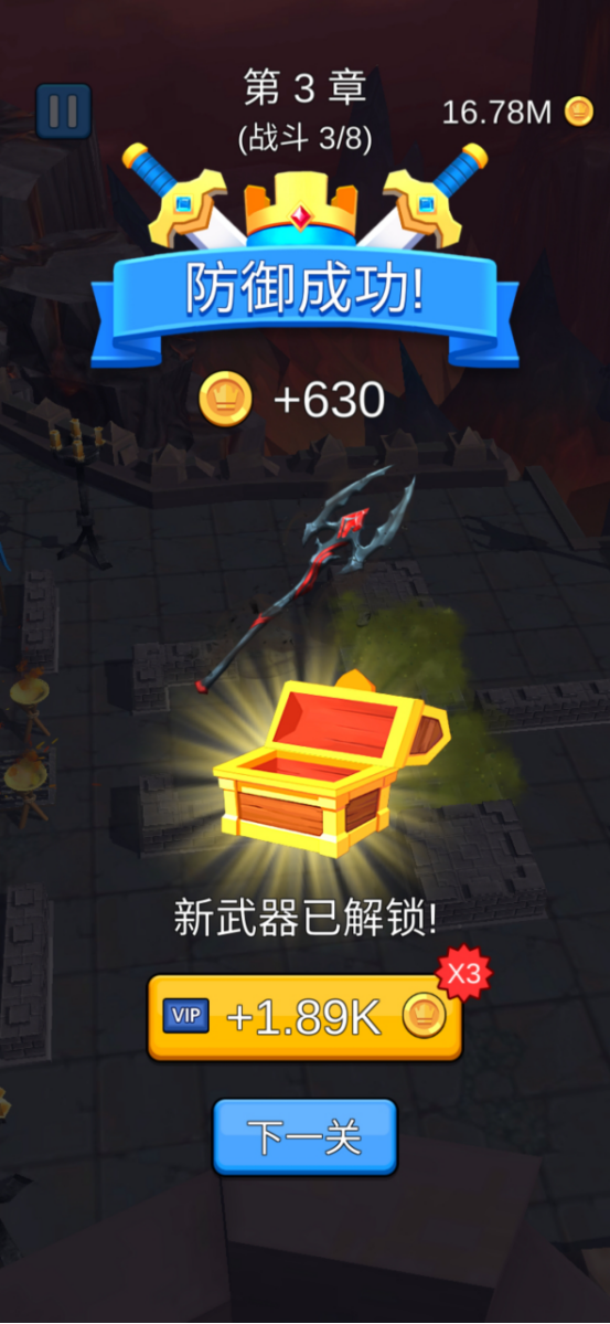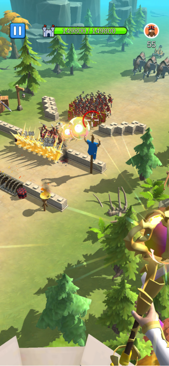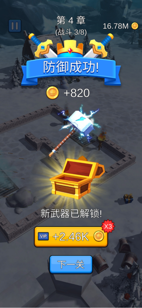 游戏以塔防题材,射击玩法进行创作,虽然定位策略性元素,但实际的操作过程中,并没有很强的策略性可言,而对于游戏本身的制作来说,还是值得肯定的,玩家通过第一视角的射击操作,不断的阻止敌人进攻城堡,而城堡的外边也是有设计一些陷阱存在,比如泥坑、炸药、突刺等,还有一些守卫城堡的士兵,有弓箭手、长矛手、盾牌手,后期更是搬出了国王角色镇守城堡,还是蛮丰富的设计,而作为游戏重点的则是玩家操作控制第一视角下的角色,玩家通过手中的武器进行射击操作不断的阻止敌人向城堡发起的大规模攻击,最终目的就是将敌人全部消灭,最后获得奖励,而游戏中也是将射击的武器通过闯关关卡的升级不断解锁,这其中包括雷神锤、神羽箭、魔法杖等各种名称的新武器,攻击的效果也是从弓箭的物理攻击到魔法杖的技能攻击,而攻击时的特效场景也是蛮有视觉沉浸感的哦。