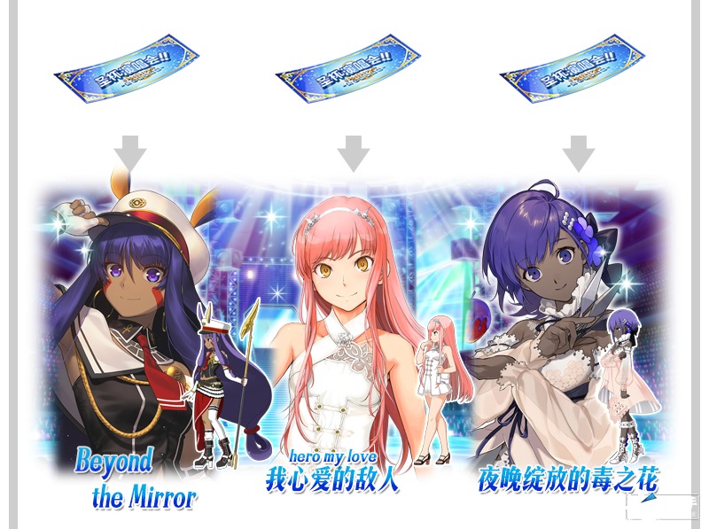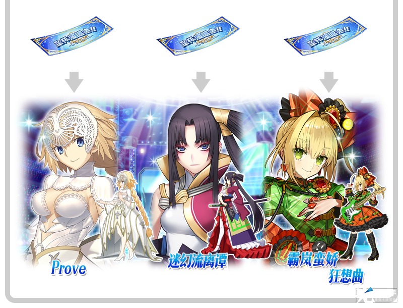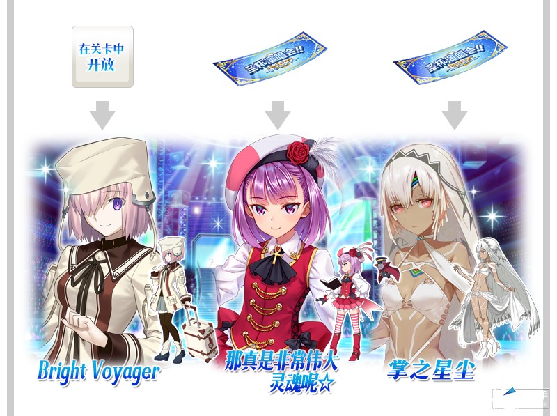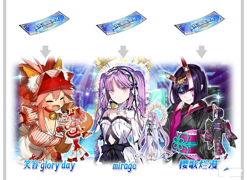 ※开放各偶像灵衣所必要的偶像灵衣开放券只能在谷雨纪念活动「闪耀吧!圣杯演唱会!!~鹤的偶像报恩~」的活动期间内获得。