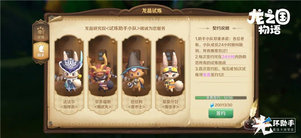 首次签约只要30蓝钻,每完成16次试炼可免费签约1次。签约试炼助手小队,就可以获得它们24小时内随叫随到的协助!