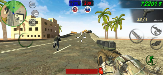 在开始上手体验之前,一定记得要先把网络关闭,不然会有一些卡顿的现象和操作不流畅的体验,还是很影响操作过程的,而且开局选择的语言也是需要选择的哦。本作的基本玩法是以射击玩法为主,虽然说是可以联机进行多人体验,但个人感觉多少有些是人机机制,不过对于一款单机手游来说,还是比较有内容在的,玩家可以通过主页面对地图场景及单人和多人模式进行选择的,而在具体的场景对战中,玩家则是以第一人称的视角进行射击对抗,还是蛮有代入感的,而在左上方也是有一个小地图的设计,可以随时的观察自己及队友所处的位置,而在操作方式的选择上 ,游戏也是有设计一个较为经典的操作方式,左边虚拟摇杆控制方向,右边各种射击键,换枪夹,扔子弹等,还是比较丰富的,而且在音效的辅助下,玩家能感受到一个较为不错的战争氛围渲染。