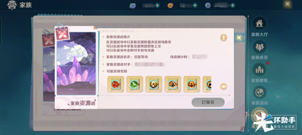 1.家族资源战需要事前由族长/副族长进行报名,而活动时间是每周的周三与周五20:15~21:00