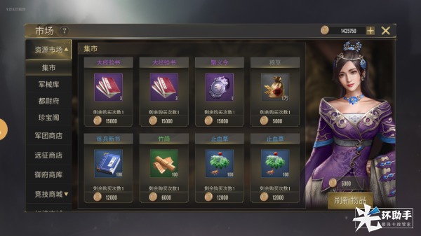 《热血三国无双》主公等级达到10级,开放集市商城,集市中会出售武将经验书、陨铁、训练材料、神器宝箱、宝物碎片、粮草等常规资源,消耗元宝或铜钱可进行购买。点击集市中的刷新按钮,可刷新当前商品。系统每日将赠送1次免费刷新的次数,免费次数耗尽后再次进行刷新需消耗铜钱。
