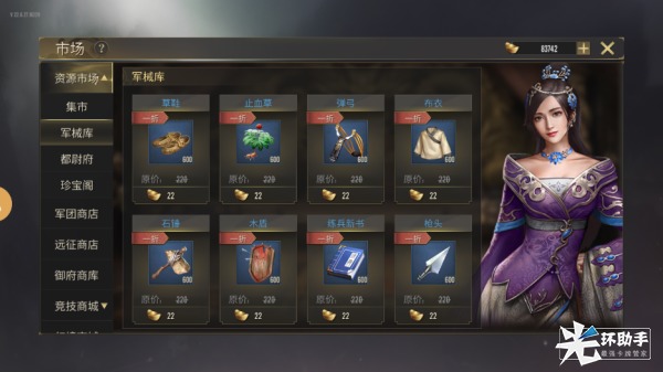 15级开放军械铺,军械铺中出售所有武将训练材料。军械铺默认开放绿色材料售卖,当玩家等级到达20、35、60级时,会分别开放蓝色、紫色、橙色材料售卖。军械铺中每日会重置商品折扣。