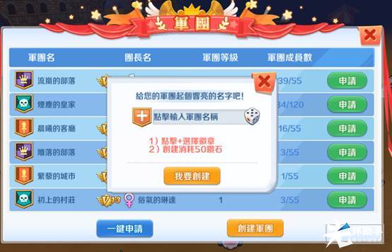 自己创建军团需要有自己的军团名字和军团徽章,另外创建军团需要耗费50钻石哦!