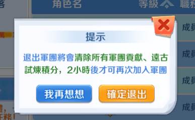 如果您觉得自己足够强大,想自立门户,也可以退出军团,但会清除所有的军团贡献,远古试炼积分,而且2小时后才可以再次加入军团。