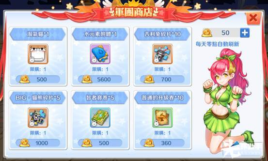 军团商店,军团玩家可以使用贡献值来购买物品,物品在每天的零点刷新。